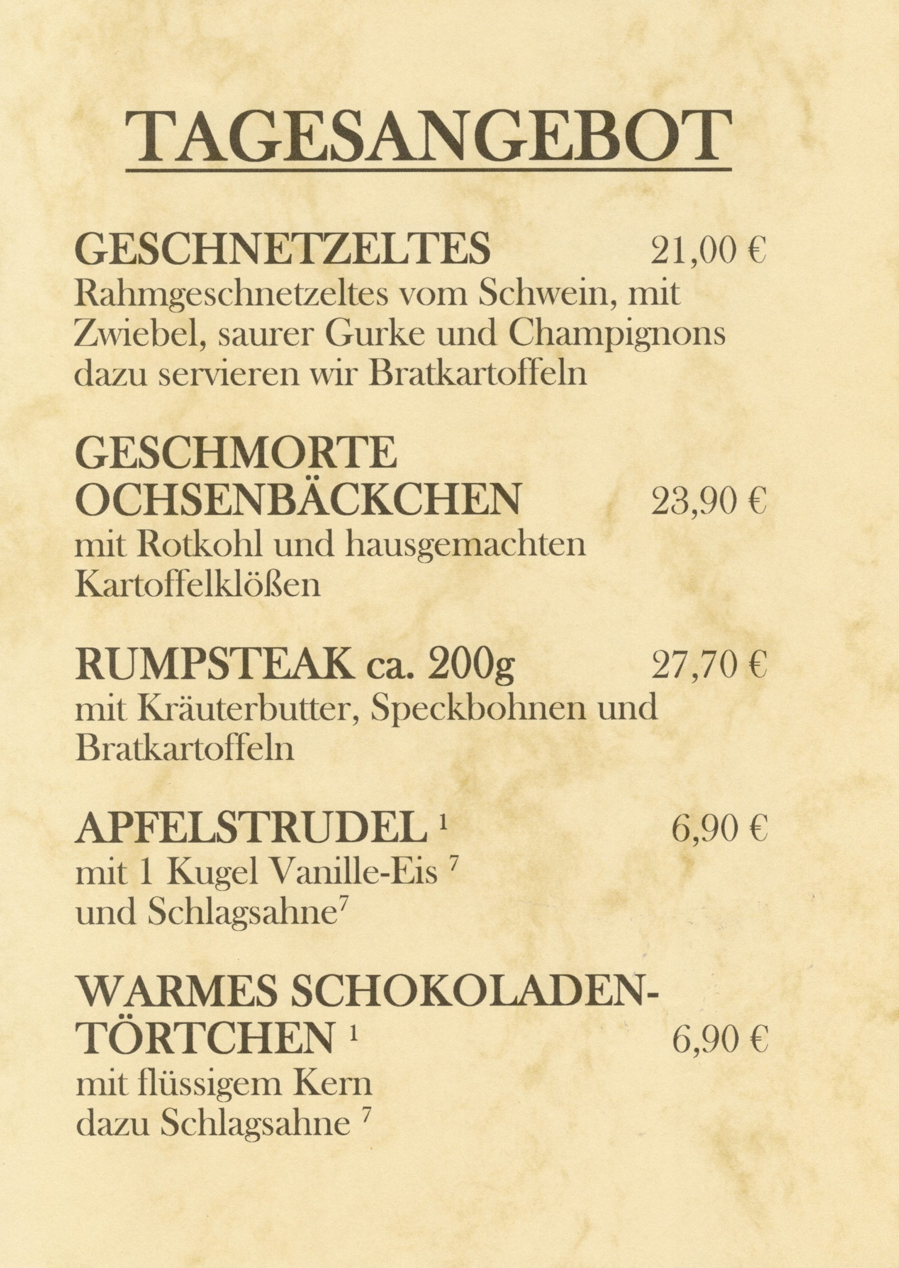 Als Hauptgericht stehen deftiges Fleisch vom heimischen Limousin-Rind in Bio-Qualität und hausgemachte Schweinesülze, aber auch vegetarische Spezialitäten auf unserer Karte.